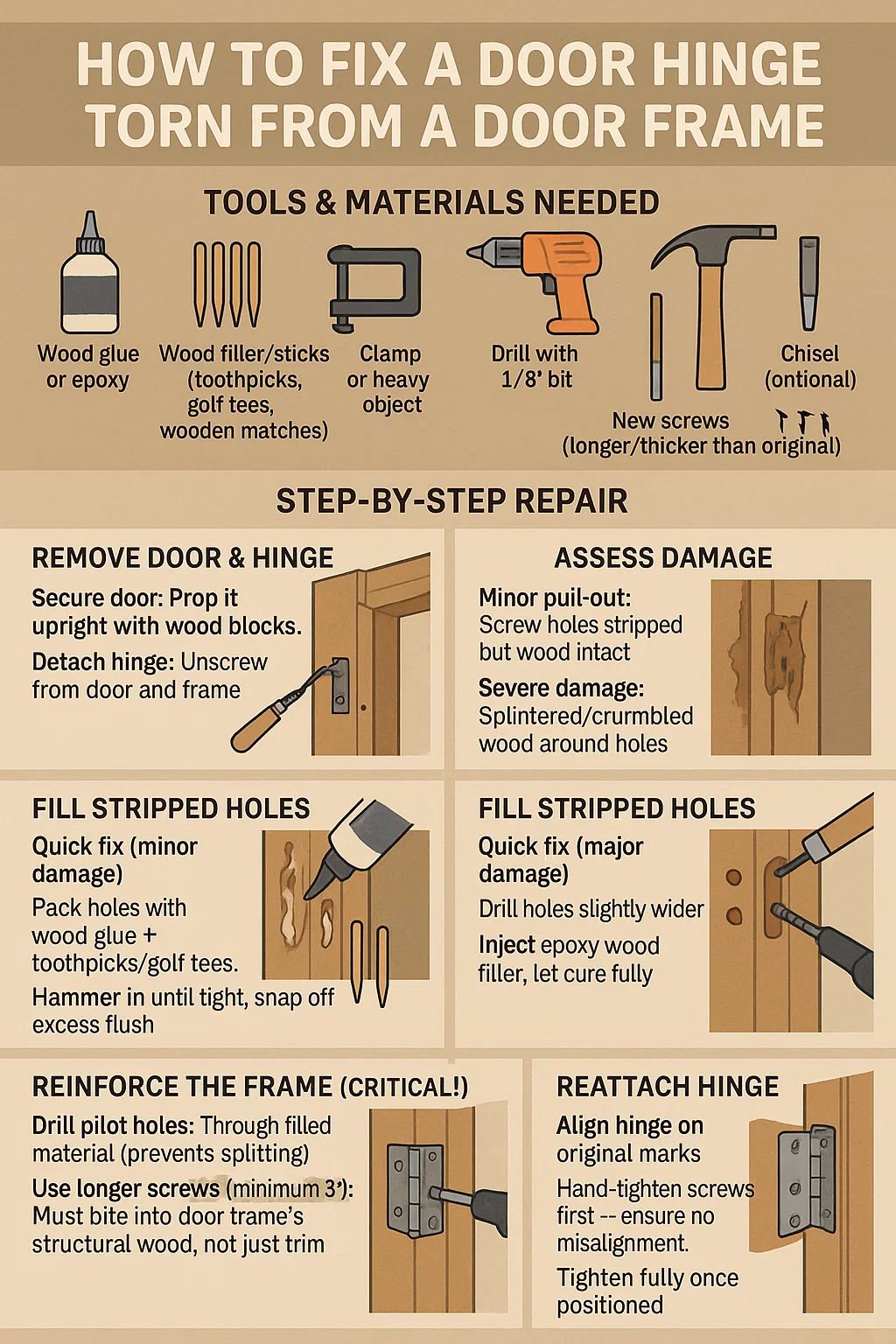Here's how to fix a door hinge torn from a door frame, step-by-step: